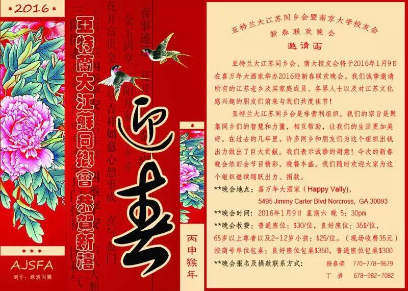 亚特兰大江苏同乡会,南大校友会将于2016年1月9日在喜万年Happy Valley大酒家举办2016迎新春联欢晚会。诚挚邀请所有的江苏老乡及其家庭成员、各界人士以及对江苏文化感兴趣的朋友们前来与我们共度佳节!我们在不同的时间来到美国,在异国他乡奋斗打拼很不容易。过去的一年里大家同心协力、相互帮助,有难共当、有福共享。羊年的春晚和今年中秋晚会大家品尝到了丰盛的晚餐,欣赏了精彩的文艺表演,气氛热烈,充分体现了我们江苏人的热情和多才多艺。2016年的新春晚会也将会是丰富多彩欢乐一堂的盛大聚会。