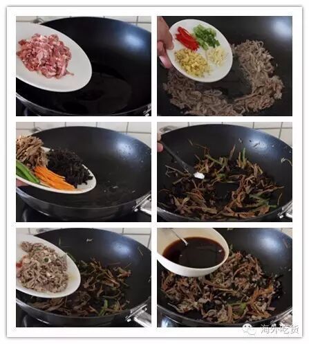 从一开始炒肉丝油就要多放些,一次性放足,后面炒配菜就不要再加冷油了。