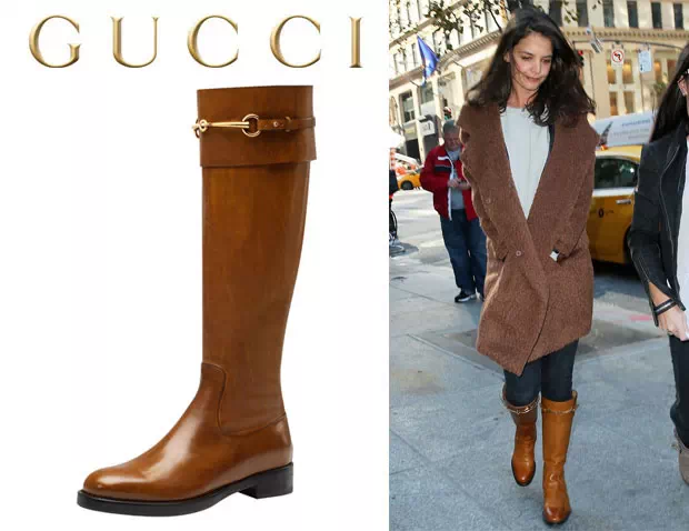 凯蒂的亮棕Gucci,靴口的金属配件凭添了几分女人味。