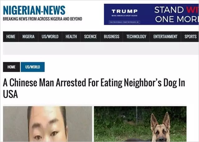 文中截屏图片英文新闻的标题是,“Chinese Man Arrested After Eating Neighbor’s Dog”,在Google上搜了一下,排除掉其中重复内容,真正刊登这则“新闻”的不到十家网站,包括stuppid.com,thenewsspike.com,sutbeat.com,worldnewsdailyreport.com,非洲太阳报africansuntimes.com,尼日利亚新闻网nigerian-news.com——都不知道是什么鬼的网站,全部都是闻所未闻。文章内容几乎完全一样;发生地点有些说的是洛杉矶,有些说的是旧金山,有些说的是温哥华。
