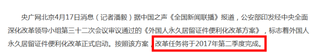 “外国人永久居留证件便利化改革启动:改革任务将于2017年第二季度完成”
