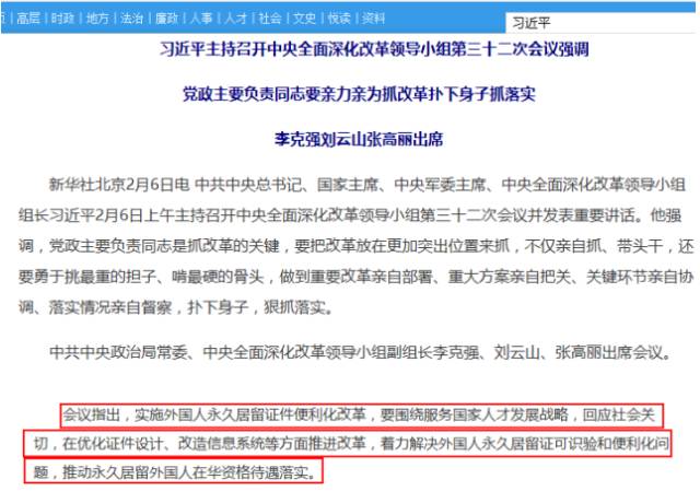 在今年2月6号上午召开的中央全面深化改革领导小组第三十二次会议上,中国政府决定实施外国人永久居留证件便利化改革。