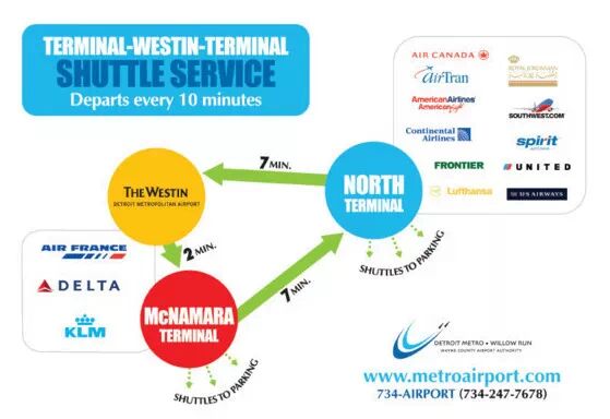 底特律机场有二个Terminal,分别是麦克纳马拉航厦(McNamara Terminal)和北航厦(North Terminal)。