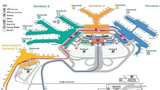 ATS列车行驶站为:三个国内机场Terminal, 国际机场Terminal, Long Term parking, the Metra station 和 PACE stop。因此,在坐ATS之前,先看清你下一班飞机的Terminal在几号。(第二张机场全图中,红色的线就是代表ATS行驶线)。