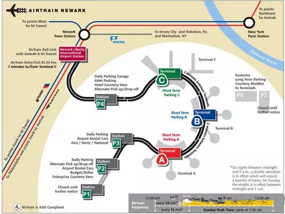 托运完行李之后,找接下去转机的Terminal,有可能大陆航空的国内航班的Terminal在A,因此你需要去坐机场内的列车。下图则为机场Airtrain的路线图,在非繁忙时段,列车是15分钟一班,繁忙时段则为3分钟一班。你需要乘坐的,就只是从Terminal A B C中间三站。