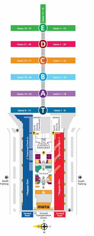 亚特兰大机场一个有七个Concourses(2012年5月新增了一个国际指廊楼 叫 Concourse F,也就是上面的第一个图),分别是Concourse T、A、B、C、D、E、F,使用地铁(SkyTrain)连接。而国际进港的国际航班一般只在 F 和 E,而美国国内航班肯定在 T、和 A-D之间的一个。因此,转机的同学肯定会需要: