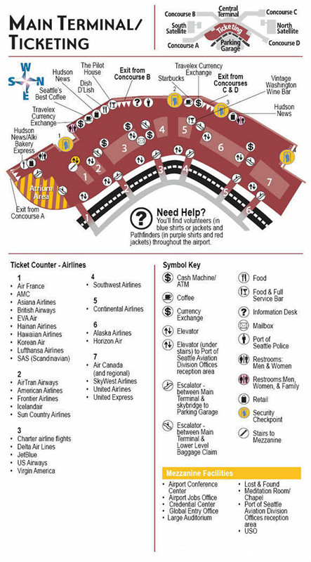 乘坐不同航空公司的飞机会在不同的机场终端(这里叫做 concourse)登陆。你们可以看到有标志Concourse A浅绿色 /B橙黄色 / C深绿色 /D土黄色的4个终端,比如乘坐的中国海南航空公司到达西雅图的终端是左边那块单独的蓝紫色方块south satellite(南卫星楼)