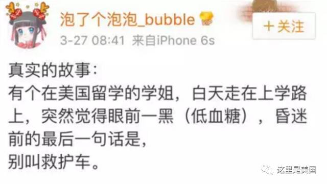 网友@泡了个泡泡_bubble 发了一条微博,一位在美国留学的学姐,低血糖晕倒前说的最后一句话就是——别叫救护车。