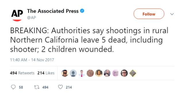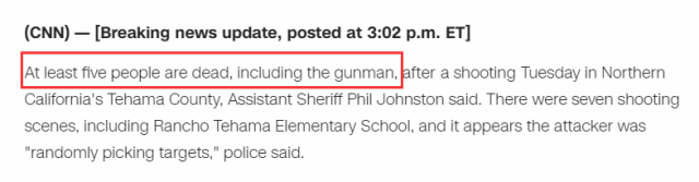 就在今天早上一所位于北加州的小学今天上学时间发生枪击案,一名枪手在现场疯狂扫射,造成5人死亡,2人受伤。