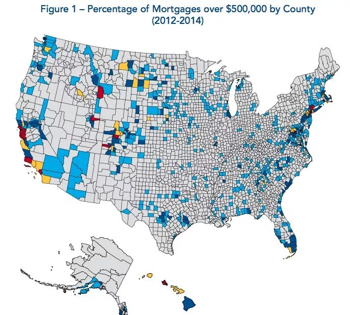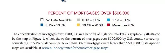 大于50万美元的房屋抵押贷款主要集中在加州,纽约州,弗吉尼亚州,新泽西州,德克萨斯州,伊利诺伊州,马里兰州,华盛顿和佛罗里达州。从图中可以看出 ,华人聚居的北加湾区,南加的洛杉矶,纽约这一比例都在百分之20以上。而加州就占全国的45.7%,这其中华人的贡献不小。