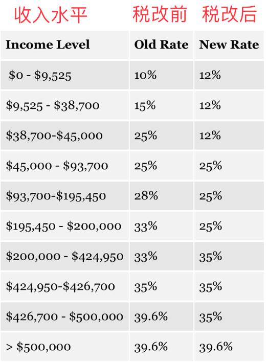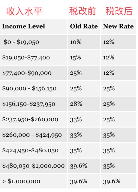 税改后:个人所得税也简化成3个等级:12%、25%、35%。富裕阶层的39.6%税率将保持不变。