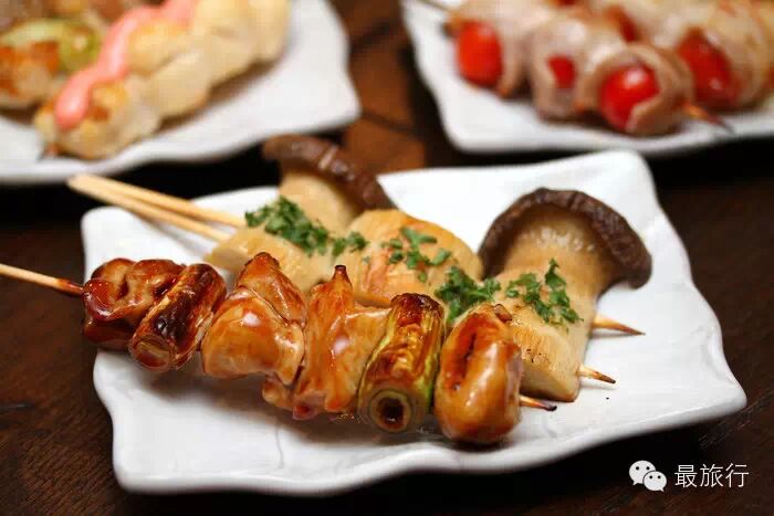 左手拿串,用手用筷子将食物取下之后在食用。