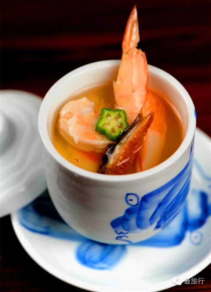 首先将陶壶里的汤汁倒入一旁的陶杯中,并挤上一些酸橘汁后品尝。之后将配菜取出放入杯子里,品尝菜与汤交会的滋味。最后将虾壳一类的留在壶里盖上盖子。