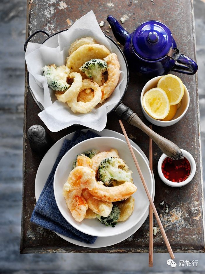 天妇罗的摆放是按照味道的浓淡,由前至后的,放在身前的一定是最淡的。用筷子将天妇罗切开,蘸上调料,并端着调料的碟子食用。遇到墨斗鱼这样需要咬开的食物时,注意不要将剩下的放回盘中,而是端着调料碟,直到吃完。