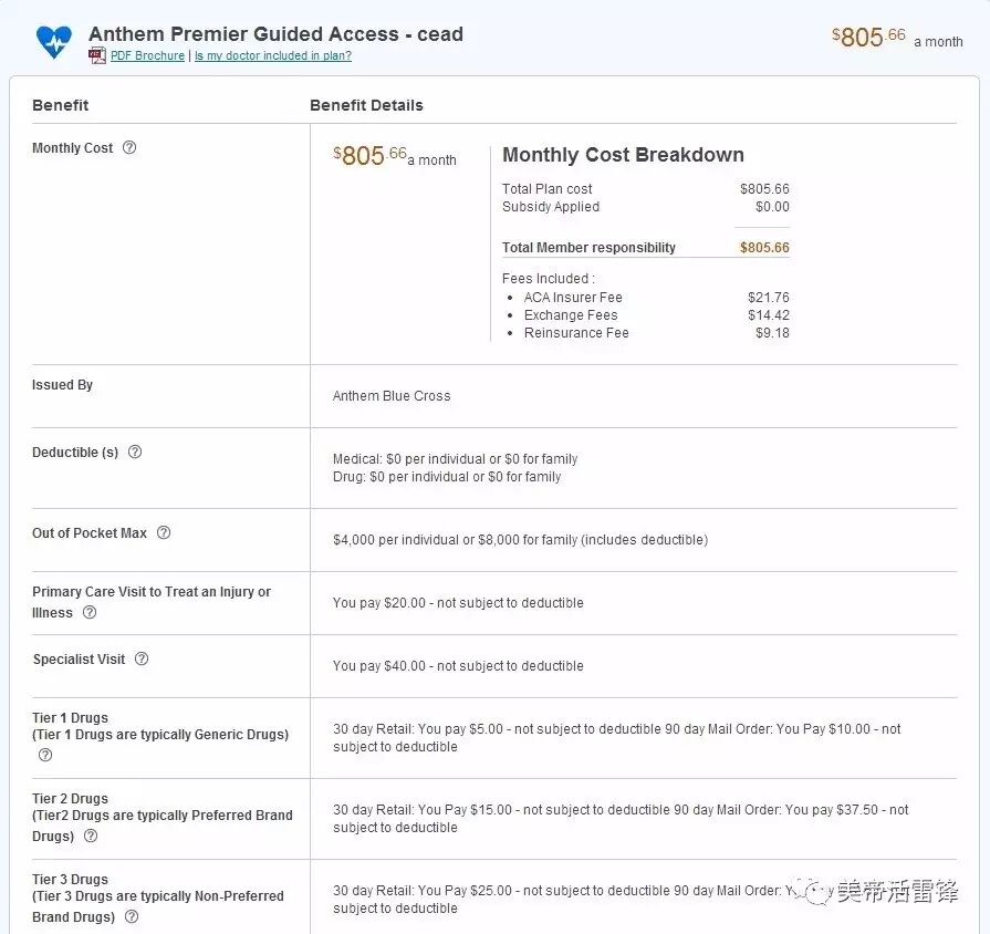 Anthem Premier Guided Access的条款和之前我们看的Kaiser Copayment Platinum非常类似,只是PPO的保险下,你有更多选择医生和医院的自主权。这份保险每月需要交纳$805.66,全年保费为$9667.92。剩下的我已经懒得再算了,大家自行脑补一下吧。
