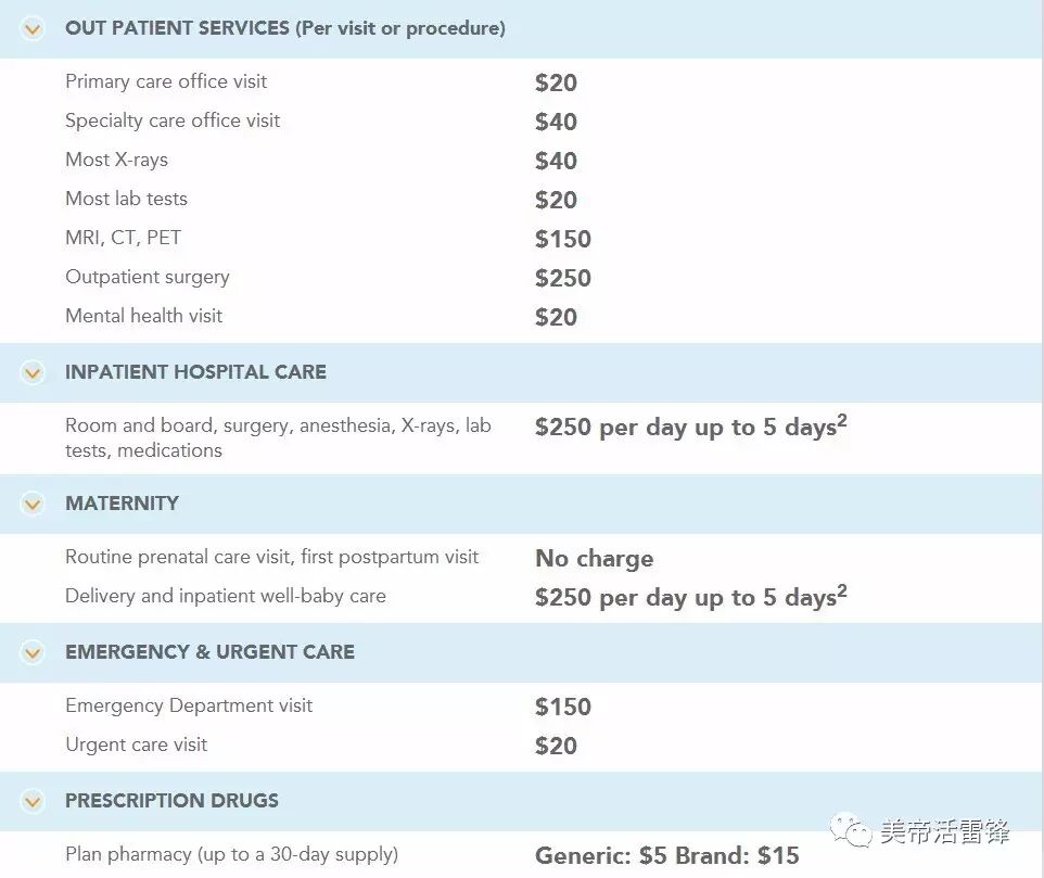 这份商业保险Copayment Platinum每月需要交纳$414.90,全年保费为$4978.8,个人医疗自付上限为$4000。不难看出这份保险的好处在于Annual Deductable是0,就是说只要买了这份保险,医疗花销就没有自付额啦。当然不是说一分钱都不用花。还有个术语叫Copayment,就是说每次去看病固定要给的钱,类似于挂号费