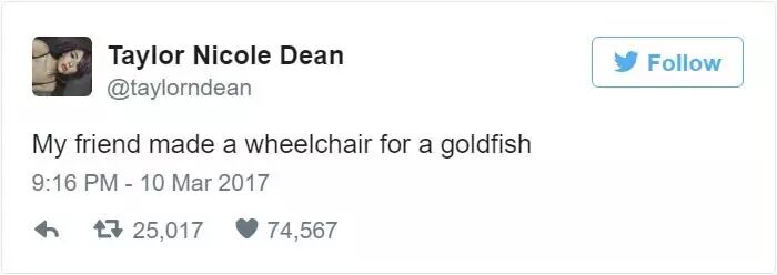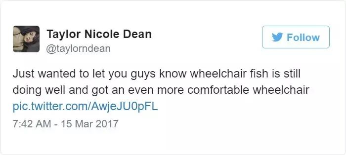 Taylor Dean是一位19岁的视频博主,经常在Youtube上传一些动物科普小视频。最近她分享了一张“坐着轮椅”的金鱼照片,在网上马上火了起来。