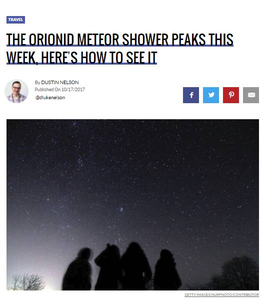 据天文爱好者们预计,今年的猎户座流星雨的最佳观赏时间,北美是在20日周五半夜之后, 而在中国有两次最佳观测时间:10月21日和22日的凌晨0时至天亮前,哈哈哈,正好周末,不如,逃离城市繁华,做个去户外追流星雨之人!