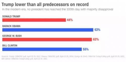 根据CNN的报道,同比奥巴马、小布什、克林顿的首个100天执政,特朗普的满意度最低,只有44%。