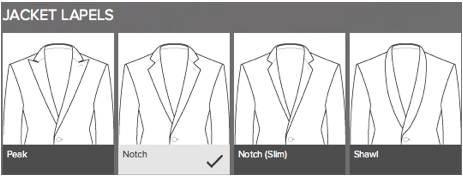 Lapel:常见的有notch,peak 和 shawl collar这三种。