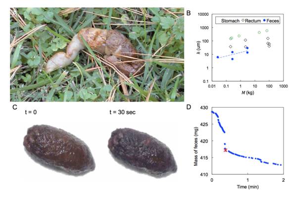 他们研究的哺乳动物体重波动范围从4千克到4000千克,但依然有很多的共同点。比如,屎条的长度一般情况下都是直肠直径的5倍。再比如,能拉出圆柱形屎条的哺乳动物们,都不是像挤牙膏那样拉屎的,更像是“一个塞子从滑梯里滑出去”( “It’s more like a plug that just goes through a chute”),动物越大,黏液越厚,拉屎时间嘛就会更快一点,能跟上大家的脚步。
