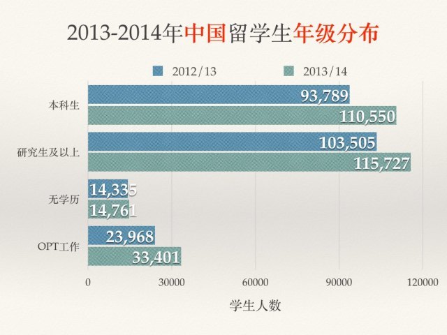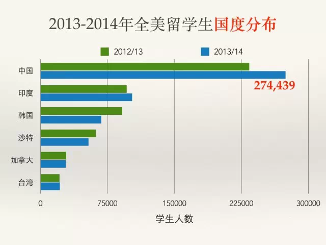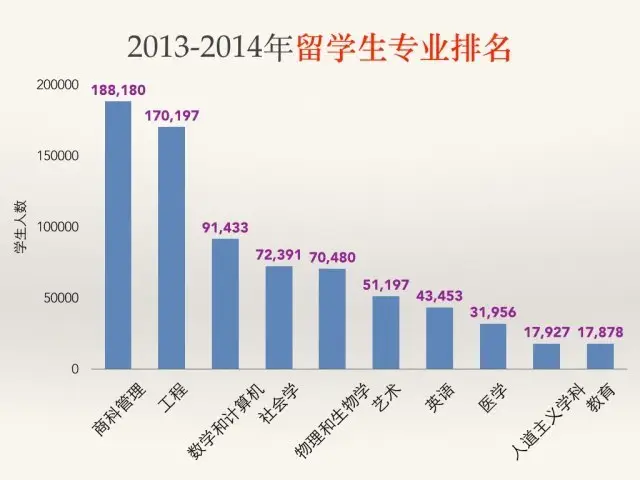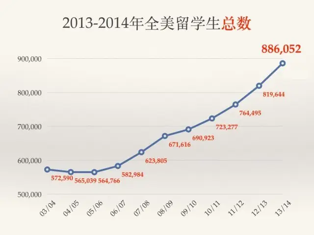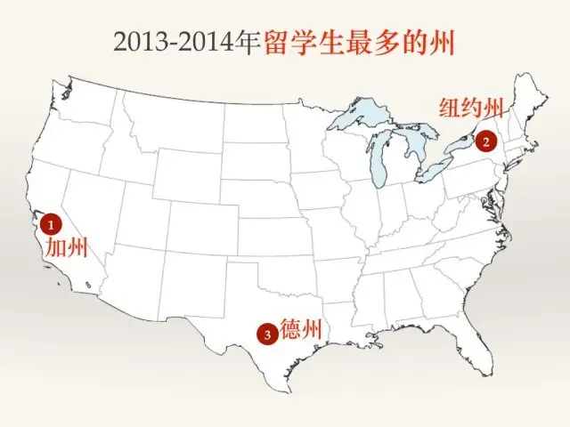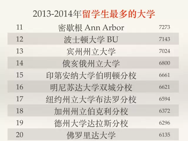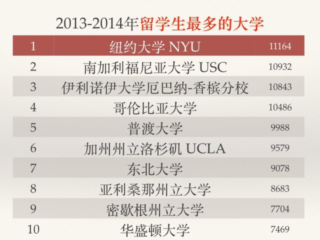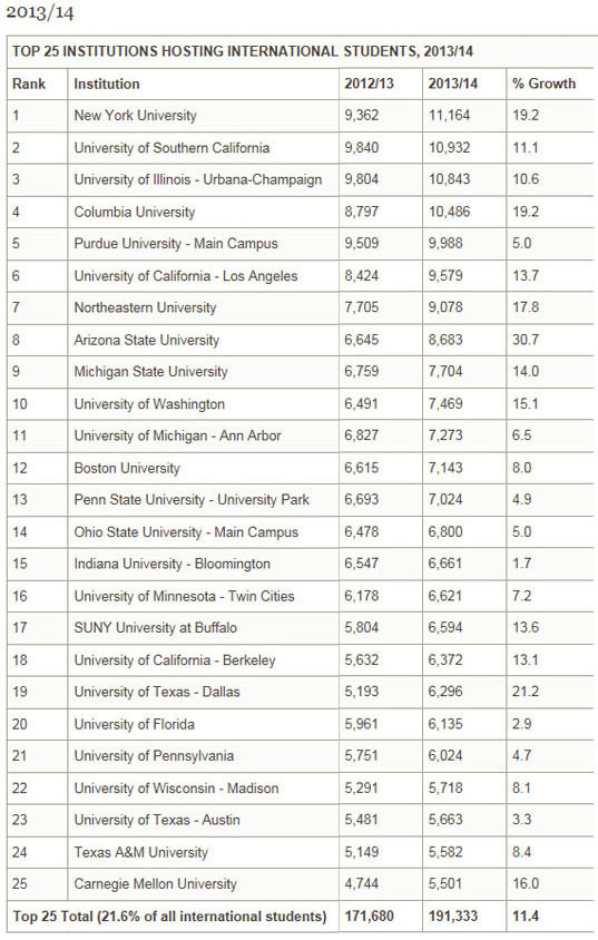 纽约大学(NYU)连续十年成为领先院校,2013/14年有国际学生11,164人。南加利福尼亚大学(USC)接待外国学生数量高居第二位(10,932人),紧随其后。伊利诺伊大学厄巴那--香槟分校(UIUC)排在第三位(10,843人)。