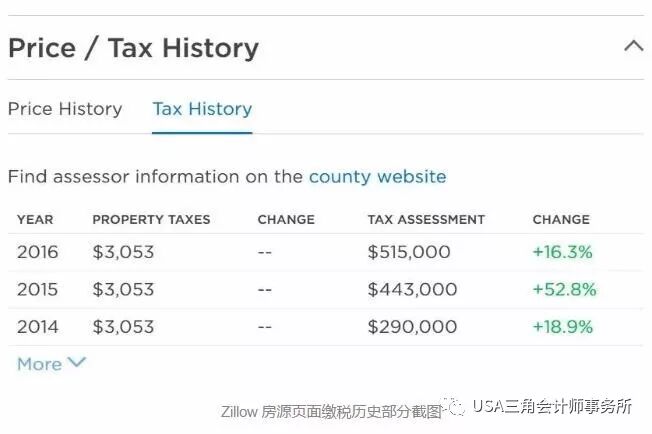 Property Taxes 为对应年份缴纳的房产税,Tax Assessment 则为当年政府部门确定的应税评估价值。二者的比值(Property Taxes / Tax Assessment)即为当年适用於该房产的房产税率。