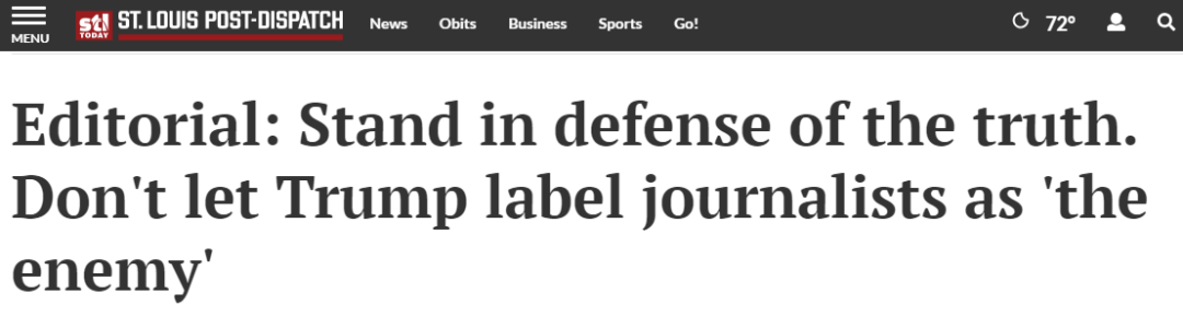 《圣路易斯邮报》也发出社论称“记者是最爱国的爱国者”:站出来捍卫真理,绝不让特朗普给媒体贴上“人民敌人”的标签。