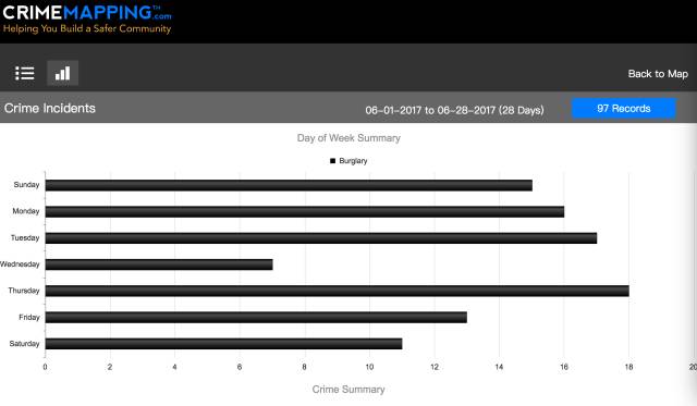 根据CrimeMapping统计,旧金山市区入室抢劫高发时段是工作日(除周三外),其中周四发生抢劫案次数最多。