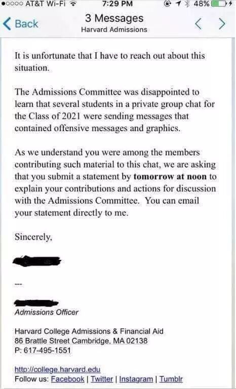 到了三月的时候,越来越多申请哈佛的孩纸收到了录取通知书,欢天喜地。但那些加入了这个群组的学生,却悲剧了...
