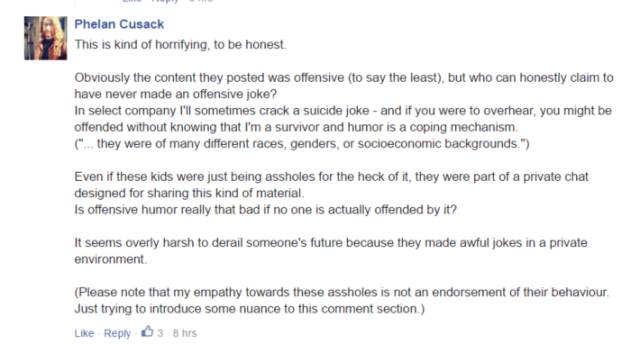 即便这些学生真的是混蛋,他们也只是在一个专门发这样的表情包的私人群组里发布。这些无下限幽默真的那么糟糕吗——即便完全没人因此而感到被冒犯?