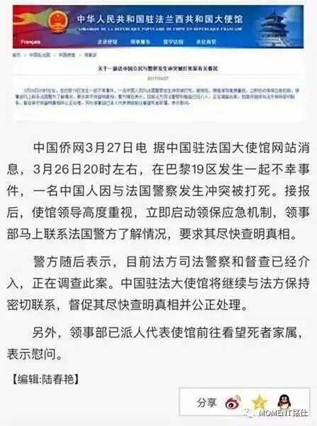 让我们欣慰的是中国外交部第一时间发出了声明,中国大使馆也表示要法国政府尽快查出真相,并且确保华人安全。
