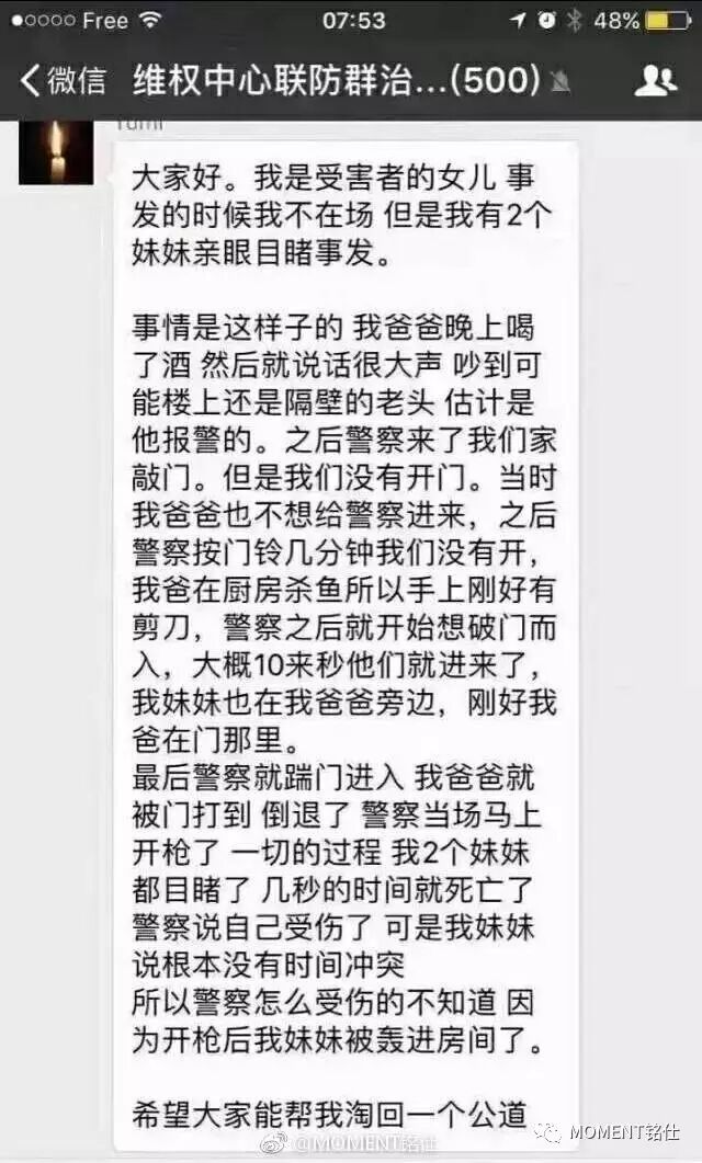 目击家属称:当时父亲正在厨房用剪刀杀鱼,听到有人敲门就过去看看,但警察夺门而入没有调查任何事实,直接开枪打死自己的父亲,父亲就死在眼前。随即,警察把他们两姐妹关在屋子里,没收手机,不能与外界联系长达数小时,并且没有及时叫救护车。