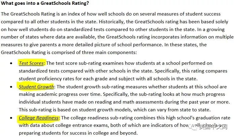 于是在这样的前提下,greatschools就放弃了以前分数当老大的标准,而同时增加了学生的进步,少数族裔的成绩和低收入学生的成绩。其中传统考试成绩在评分中占47%,学生的进步占25%,非裔、西裔等学生和低收入家庭的百分比高达28%。