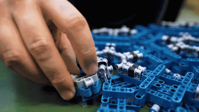 这是一种由三角形作为基础,互相连接的网状结构,它们被称为乐高「织物」。在拼插连接后,这些碎片逐渐形成了一片可以实现弯曲效果的乐高网: