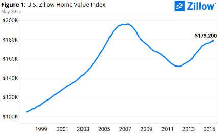 近些年来,美国房价一直不断上涨。下图是1999年至2015年房价中值的涨势: