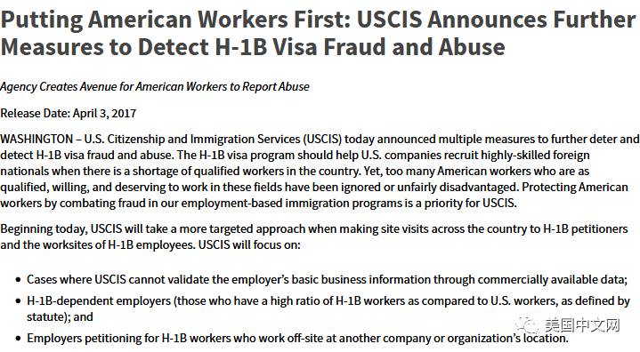 但是,就在今天申请开始的同一时间,移民局官网同时发布了一则重要通知:《以美国员工优先:USCIS宣布将进一步严厉打击H1B签证欺诈及滥用》