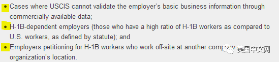 对于移民局无法通过商业广告验证业务信息的雇主; H-1B依赖性雇主(按照法规定义:H-1B工人比例高于美国工人)和雇主向在另一公司或组织H-1B工作人员提交申请。这些都将被划为严查对象。